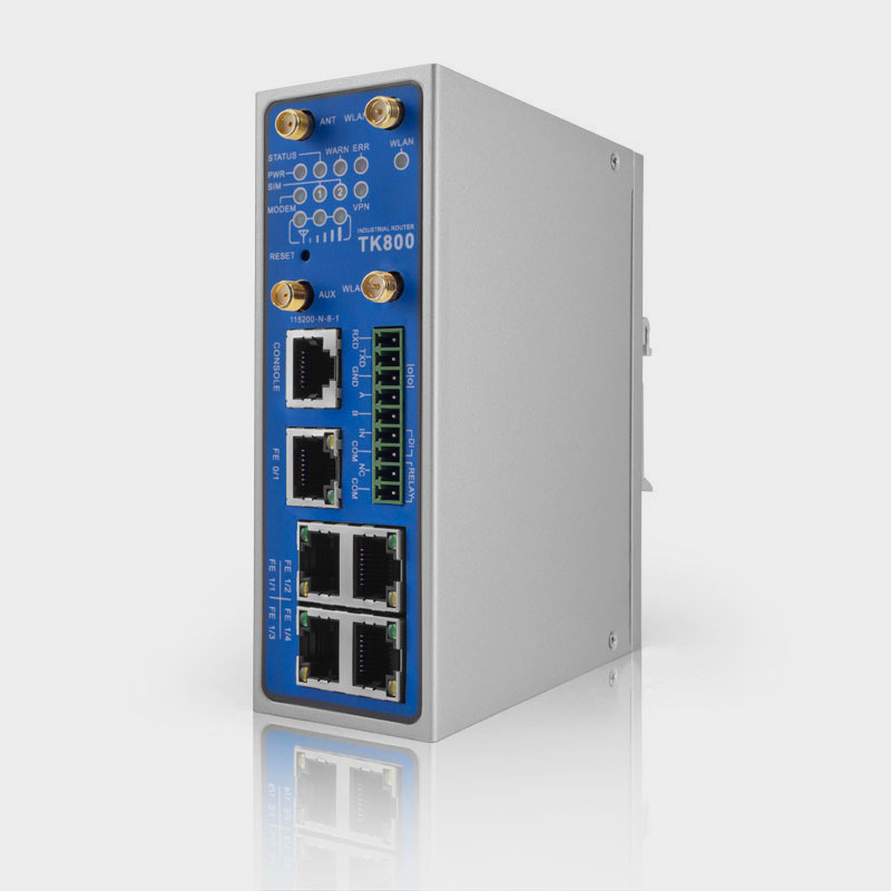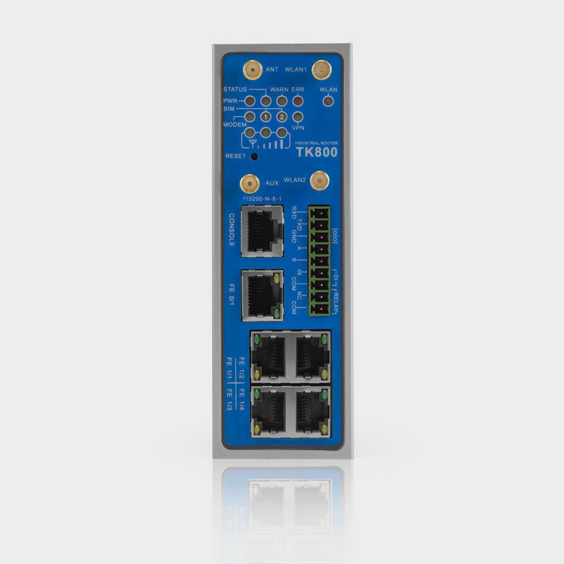 El TK815L-EXW tiene cinco puertos Ethernet RJ45, uno de ellos puede utilizarse como puerto WAN (IP estática, DHCP. PPPoE). Soporte de E/S: Una entrada digital y una salida de relé permiten la conexión con sensores y actuadores.